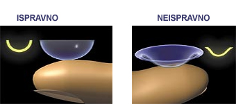 POSTAVLJANJE SOČIVA - KORAK 4 Proverite da li je sočivo izvrnuto na pravu stranu. Kada je sočivo okrenuto na ispravnu stranu, imaće oblik činije i uvijaće se ka unutra prilikom stiskanja dlanom ili između prstiju. Kada je kontaktno sočivo izvrnuto naopačke, imaće oblik tanjira i uvijaće se ka spolja prilikom stiskanja